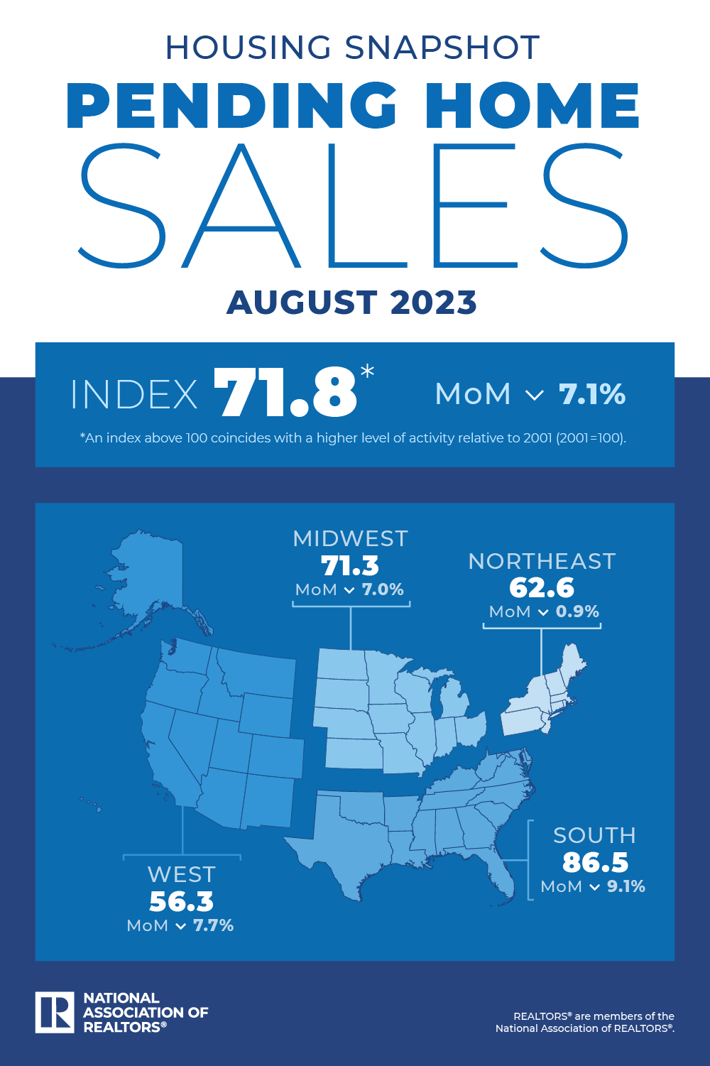 Pending-home sales dropped 7.1% from July to August as mortgage rates topped 7%, sapping homebuyer demand, the National Association of REALTORS® said, citing its Pending Home Sales Index.