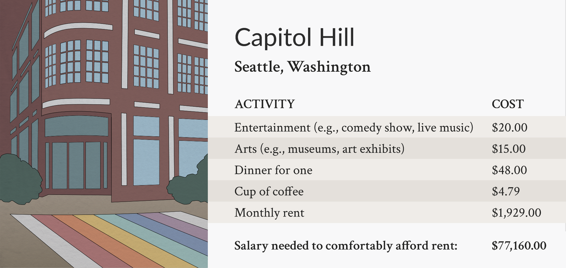 The typical monthly rent in Capitol Hill costs $1,929, meaning renters need a salary of at least $77,160 to rent comfortably. But this is one of the West Coast’s coolest neighborhoods, according to Seattle’s tourism center. People don’t just want to live here — they want to have a full social life too.