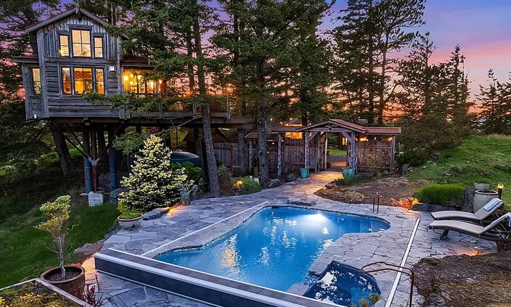 Featured on the Animal Planet series “Ultimate Treehouses,” the picturesque forest getaway is supported by six Douglas Firs on Kahboo Hill. In addition to the main treetop home, the property also includes a stone cottage, outdoor kitchen, in-ground heated swimming pool and over 30 acres of land.