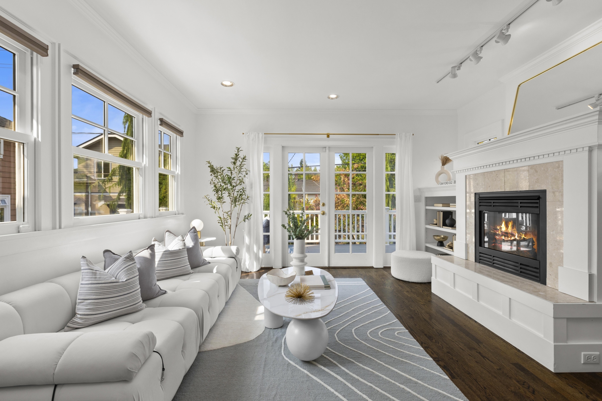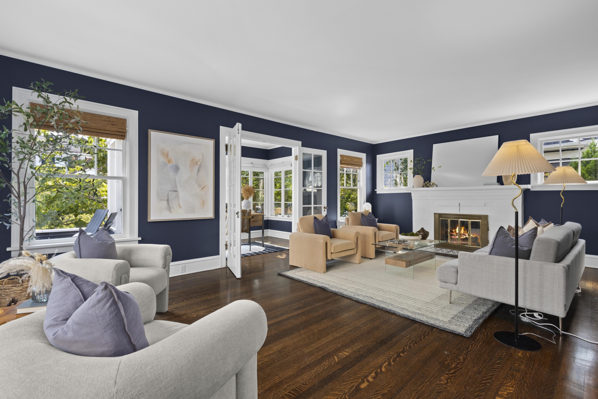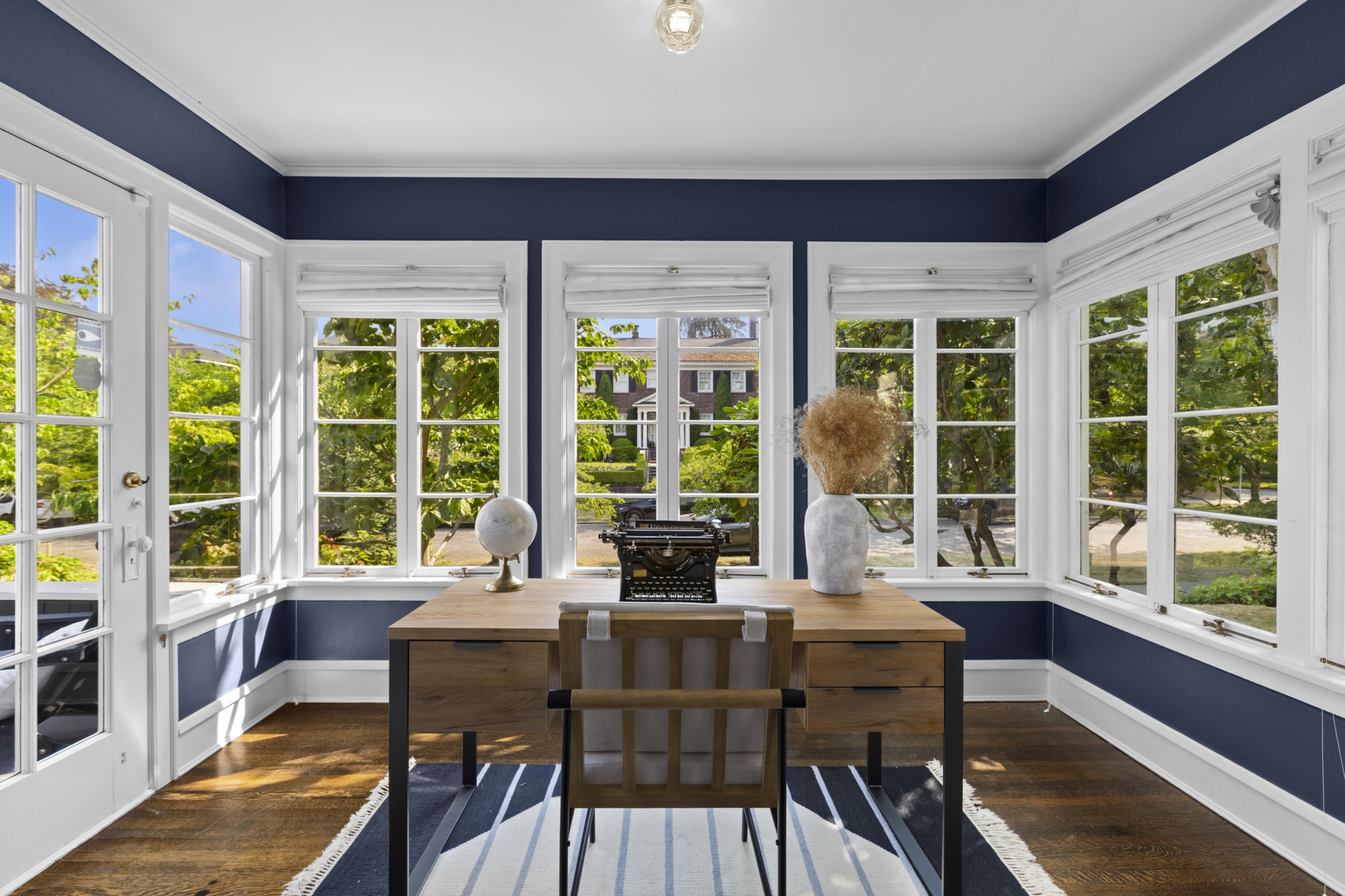 The main level offers beautifully connected living spaces with a moody and spacious living room that leads into a bright sunroom/office, framed by windows with access to a private deck. It makes for the perfect retreat for work or enjoying your morning coffee.
